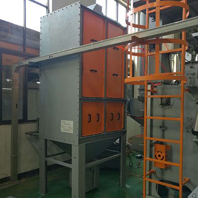 将工件放入橡胶履带滚筒中,操作人员按下“运行”按钮,抛丸室门气动关闭,抛丸清理开始,履带向前运行,工件不断地进行翻滚,强力抛丸器将抛丸高速抛射到正在翻滚的工件表面上,工件可均匀地得到清理。钢丸通过履带上的溜孔流入螺旋输送机,再将钢丸输送到斗式提升机,经斗式提升机提升到分离器,被分离后存储待用。抛丸结束后,抛丸室门自动开启,履带反转,将工件卸出。