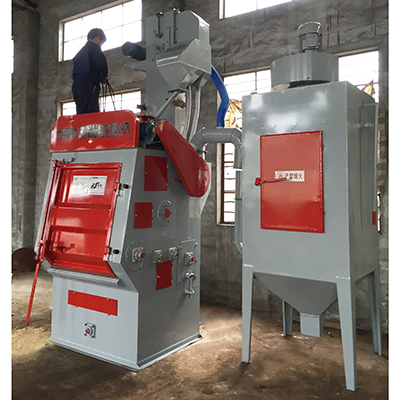 将工件放入橡胶履带滚筒中,操作人员按下“运行”按钮,抛丸室门气动关闭,抛丸清理开始,履带向前运行,工件不断地进行翻滚,强力抛丸器将抛丸高速抛射到正在翻滚的工件表面上,工件可均匀地得到清理。钢丸通过履带上的溜孔流入螺旋输送机,再将钢丸输送到斗式提升机,经斗式提升机提升到分离器,被分离后存储待用。抛丸结束后,抛丸室门自动开启,履带反转,将工件卸出。